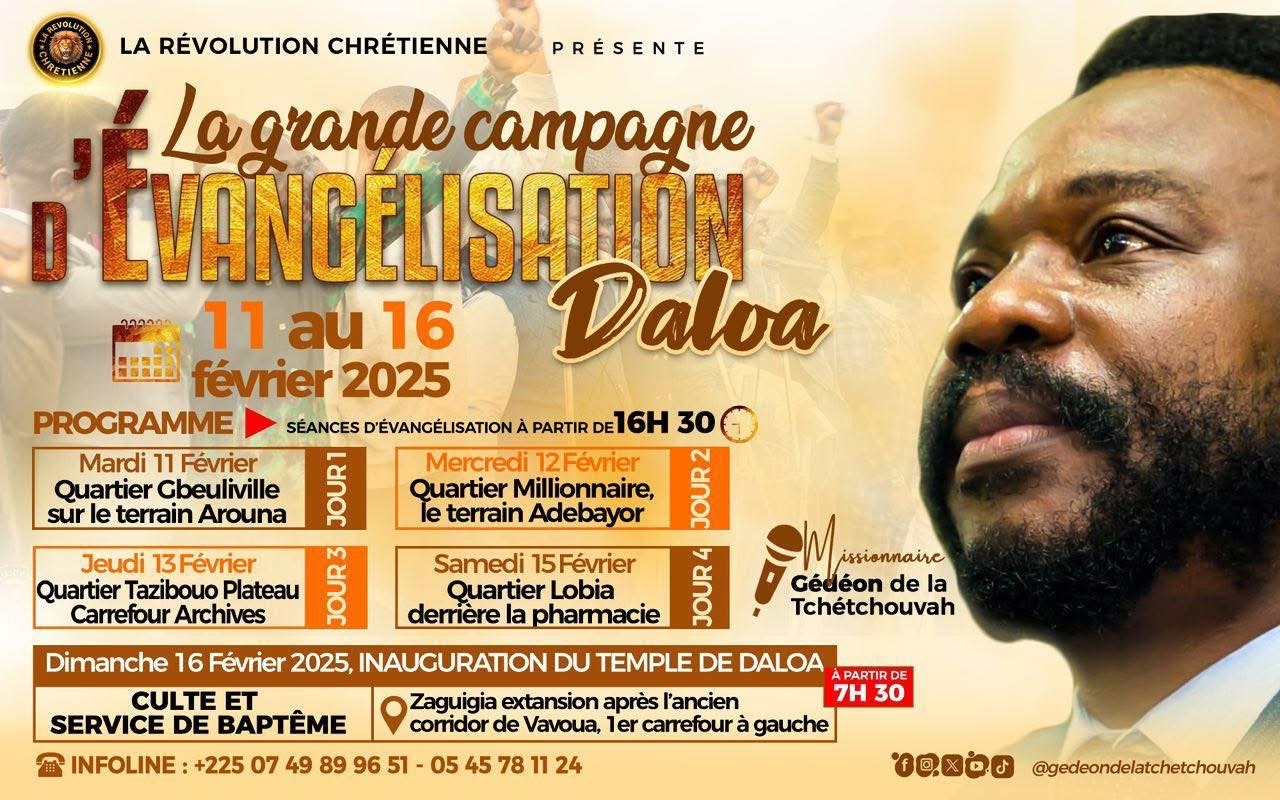Jésus-Christ est le Grand Dieu sauveur et toute sa volonté s’accomplira en tout temps et en tout lieu.C’est pourquoi nous serons à Daloa du mardi 11 au dimanche 16 février 2025 pour exécuter sa volonté.
